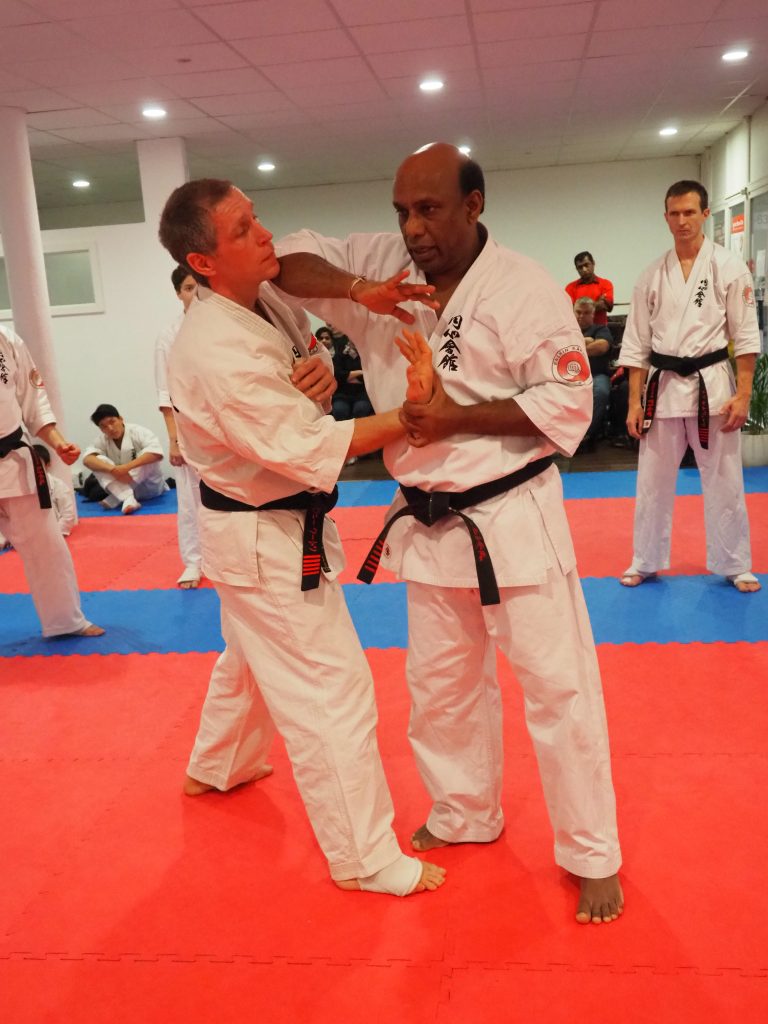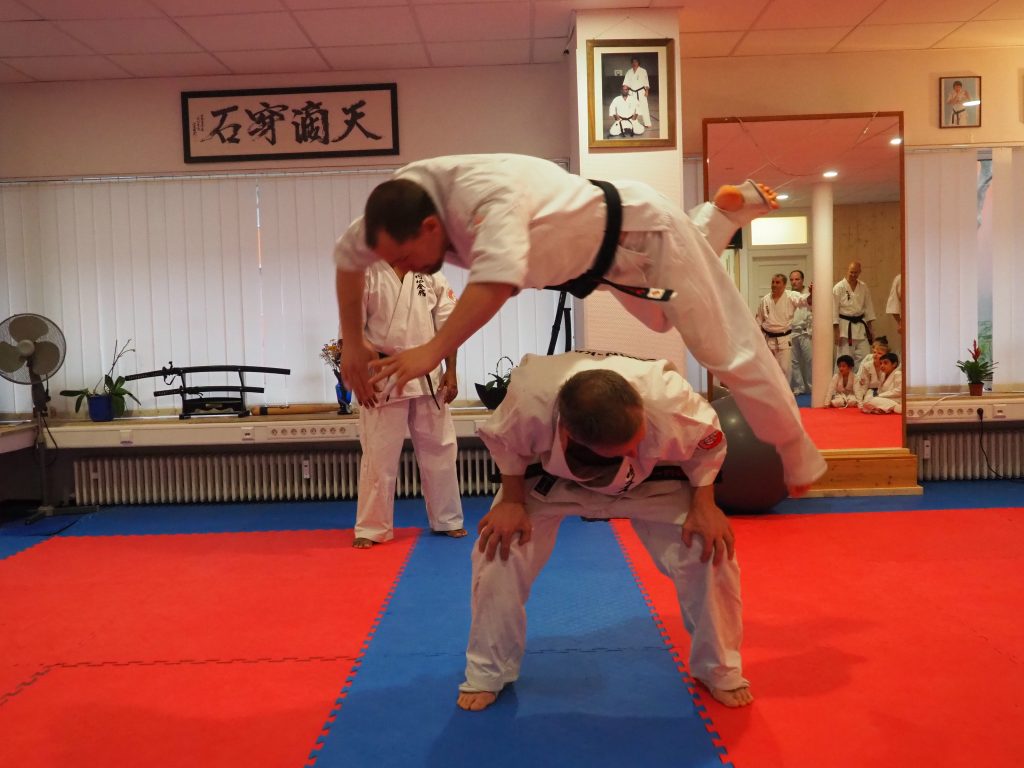 Insbesondere die Bedeutung der Würfe und das Verwenden von Techniken aus der Kata bzw. Formen wurde dabei vertieft geübt. Zudem unterrichtete Shihan die vielseitige Nutzung von Ellbogentechniken.